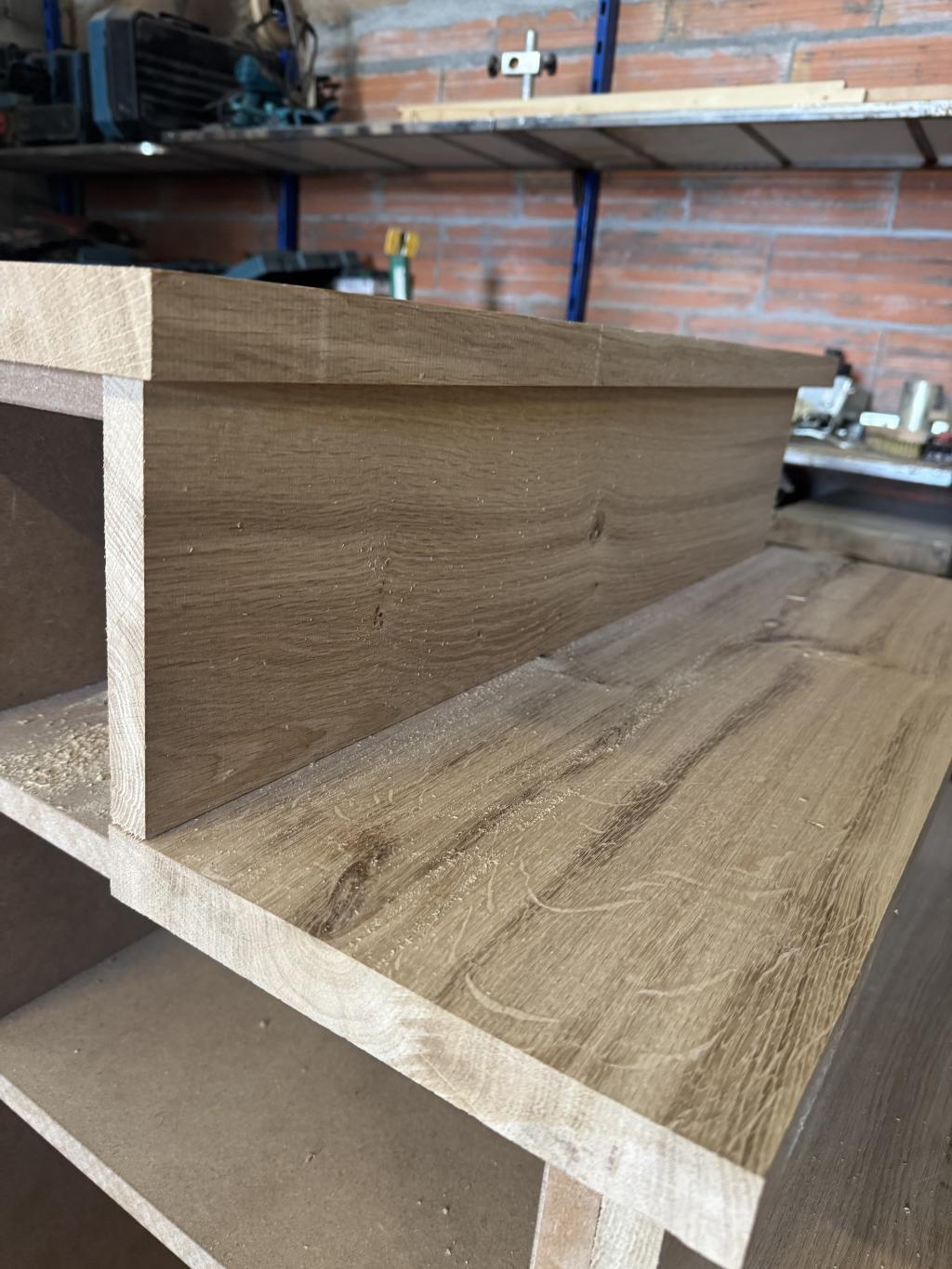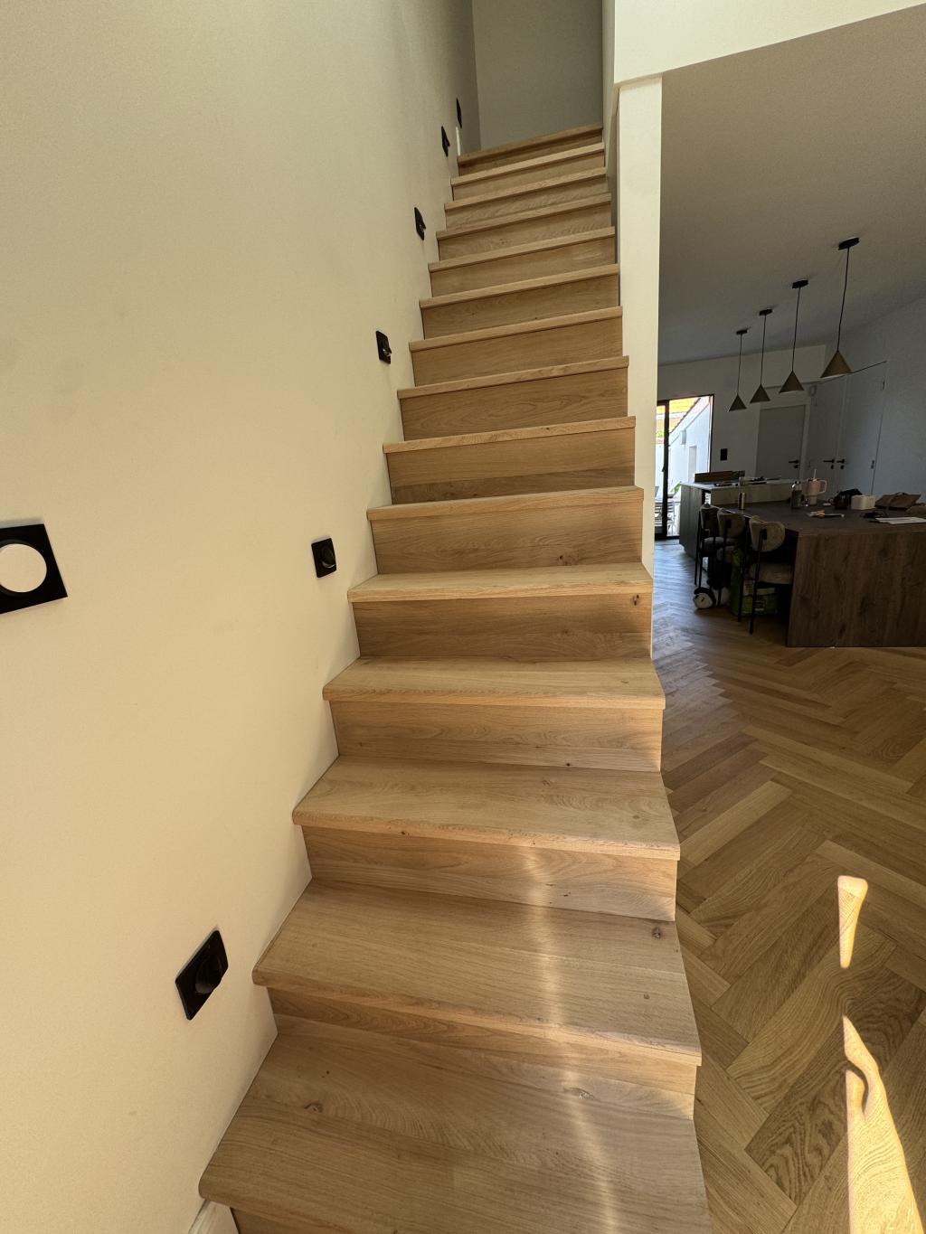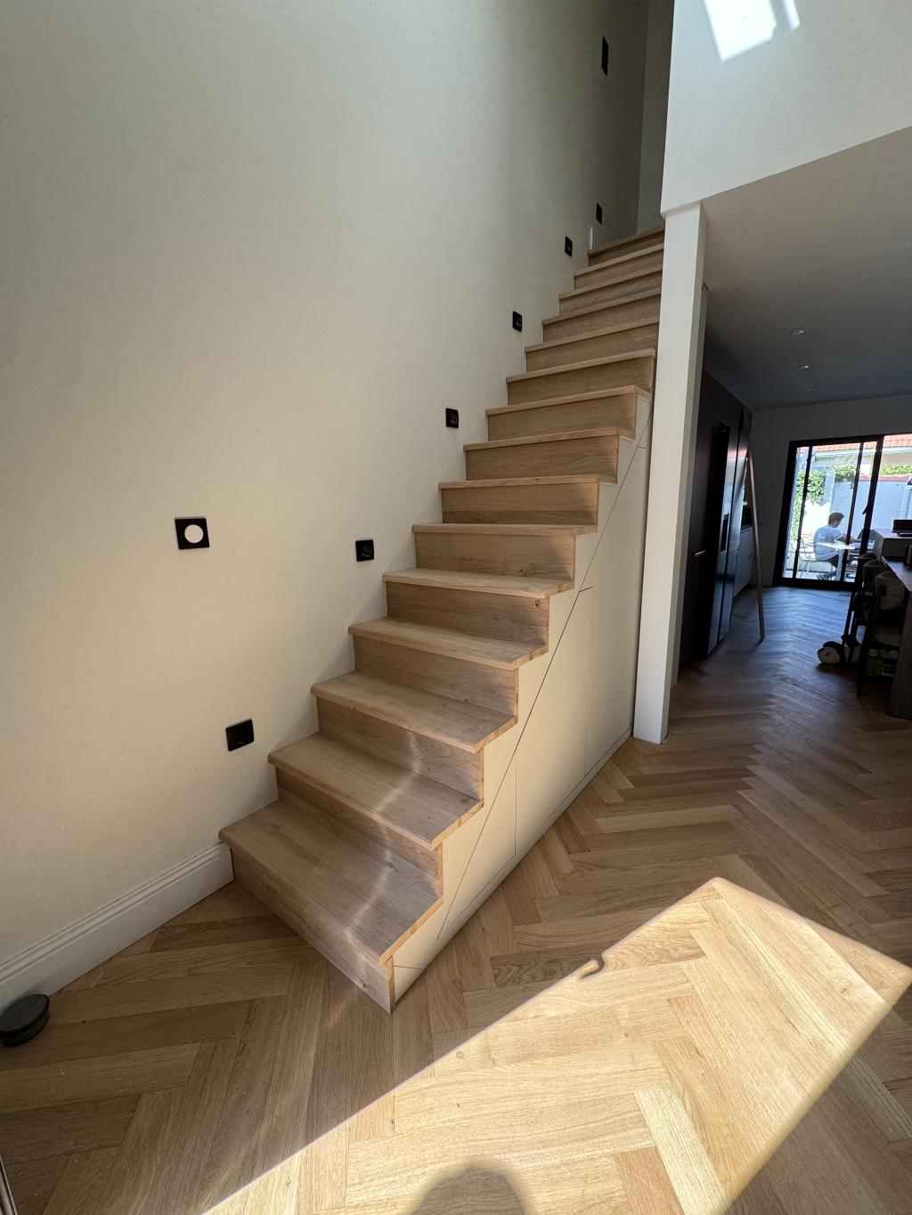 Habillage des marches et contremarches en chêne massif, pour la solidité et l’élégance.
