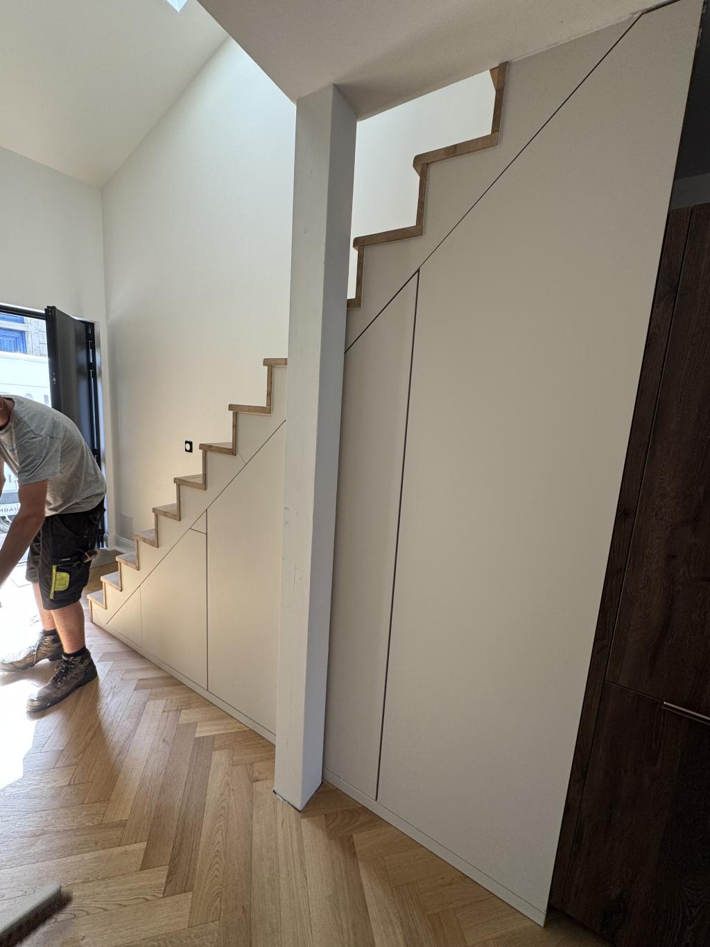 Chaque marche et chaque recoin sont optimisés : derrière l’escalier, des placards sur mesure offrent un maximum de rangements, discrets mais ultra-pratiques.