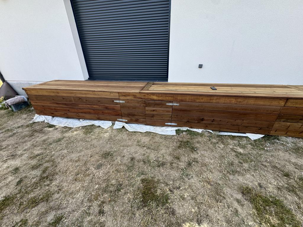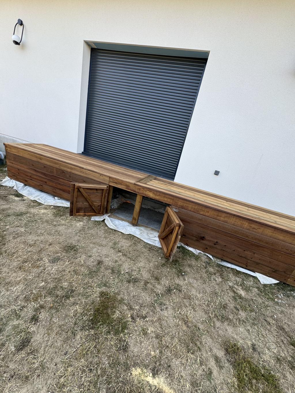 Sur cette base solide, nous avons dressé l’ossature en bois, puis habillé l’ensemble avec un platelage en pin classe 4, reconnu pour sa résistance en extérieur.