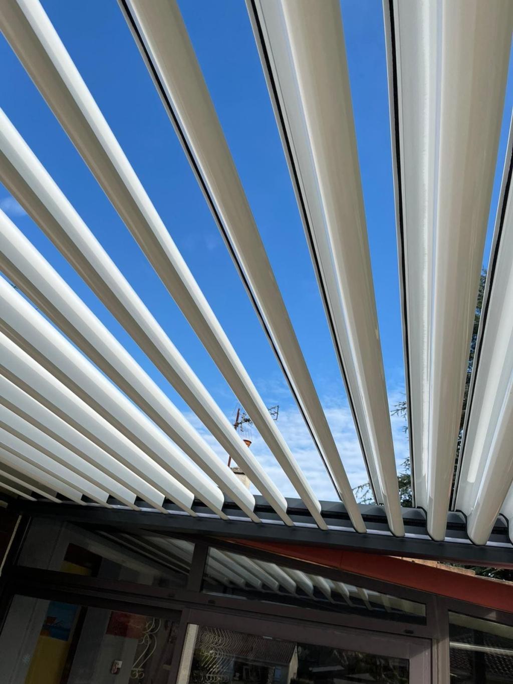 2️⃣ Pose des lames orientables : Contrairement aux pergolas classiques à toiture fixe, ces lames s’adaptent à l’ensoleillement : ouvertes pour laisser passer la lumière, fermées pour créer de l’ombre et protéger de la pluie.