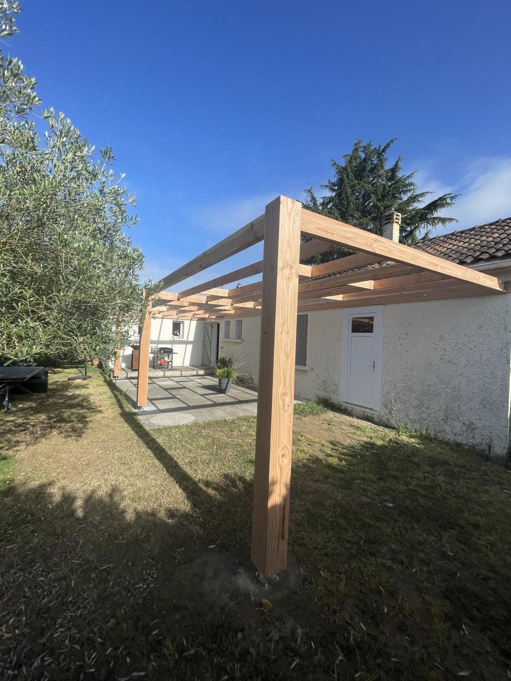 Fixée solidement à la façade, notre structure s’appuie sur des poteaux robustes ancrés dans des plots béton. Résultat : une pergola stable, durable, et surtout prête à évoluer selon les envies.