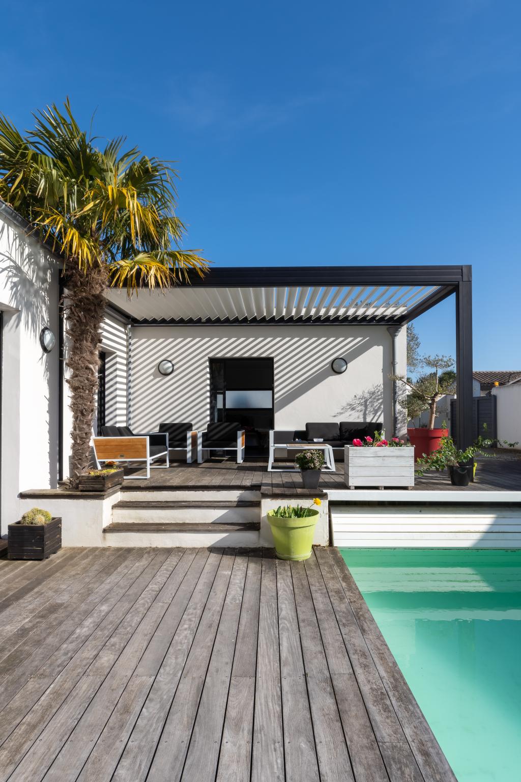 Avec une pergola bioclimatique signée Gombaud Menuiserie, votre terrasse devient un vrai coin de paradis, été comme hiver.
