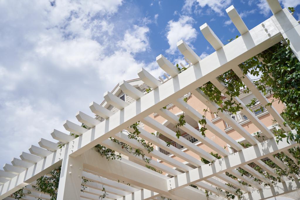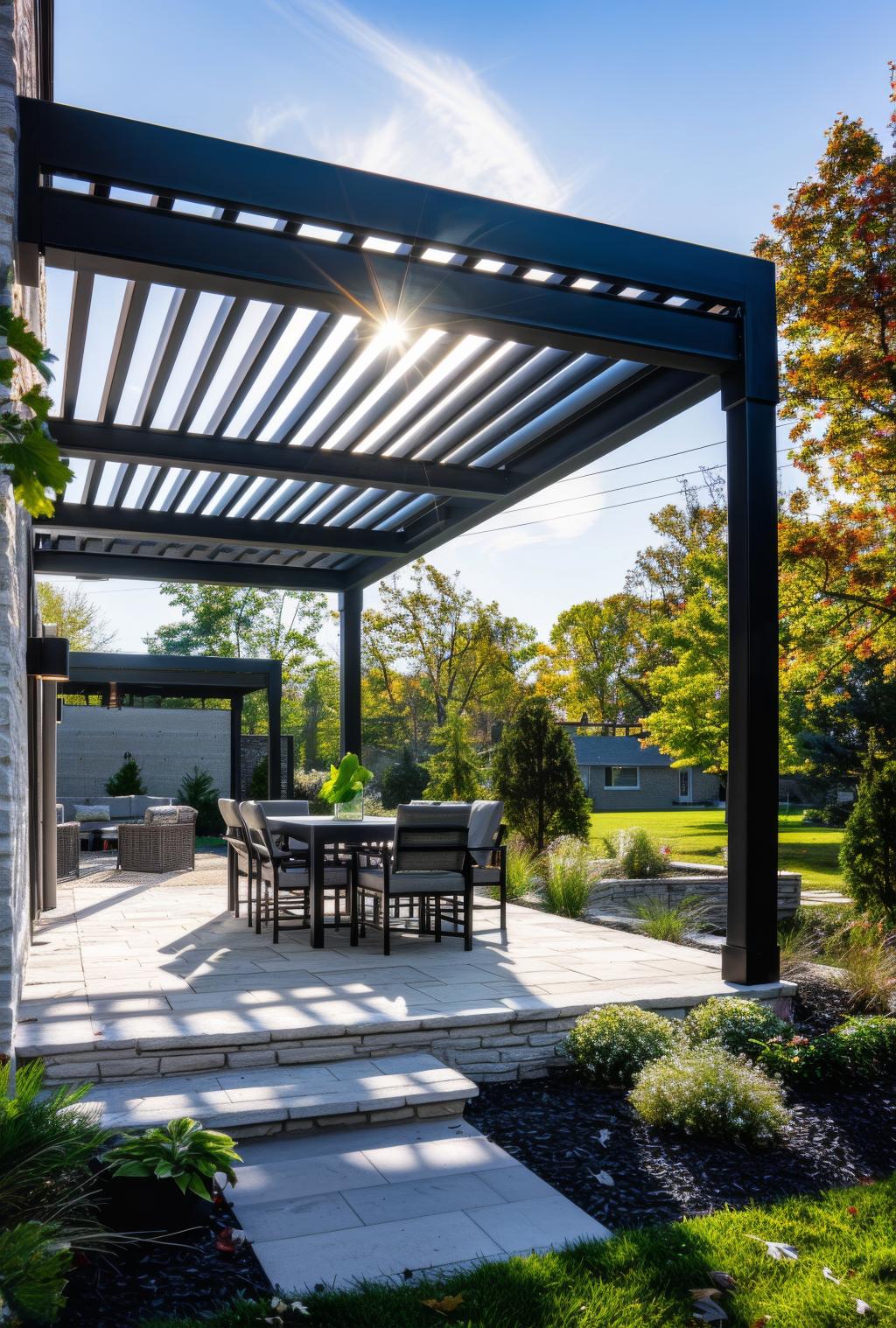Et vous, vous êtes là — bien installé sous une pergola bioclimatique signée Gombaud Menuiserie.