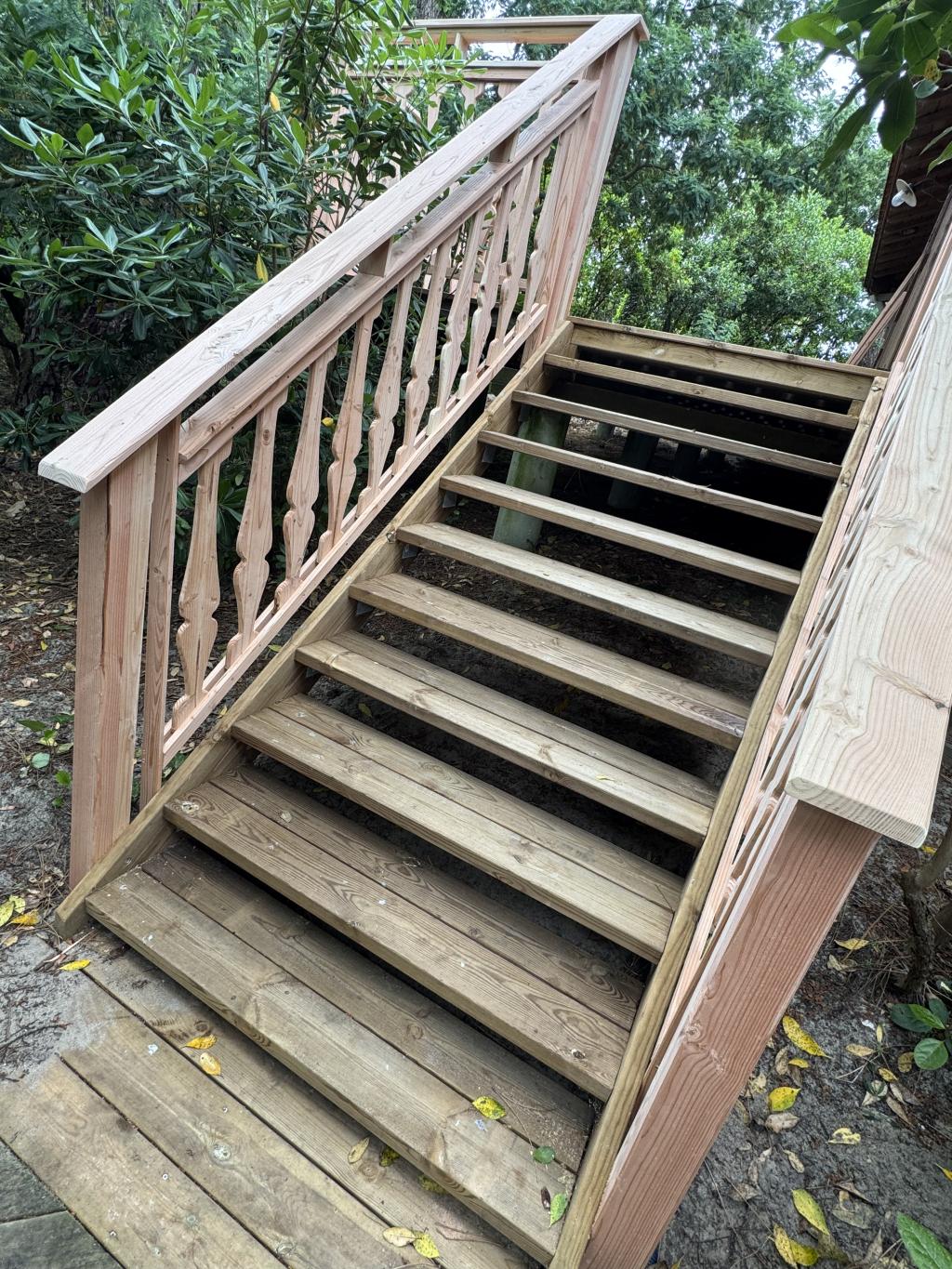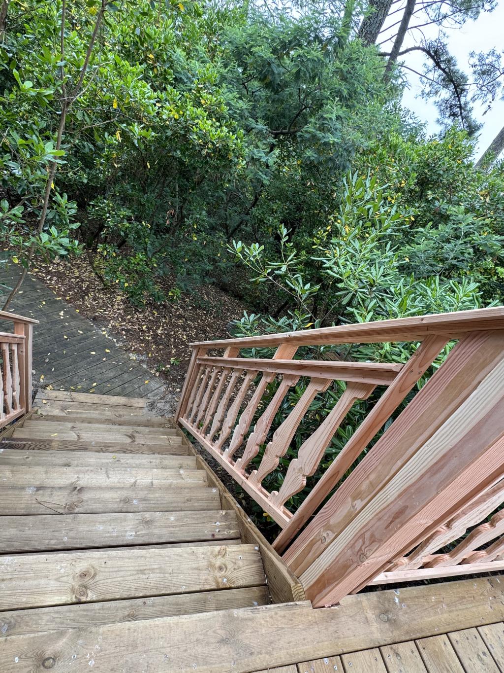 🛠 Résultat : un garde-corps solide et esthétique, à la fois authentique et élégant, qui s’intègre parfaitement à la terrasse et sécurise l’accès à l’escalier dans un environnement naturel.