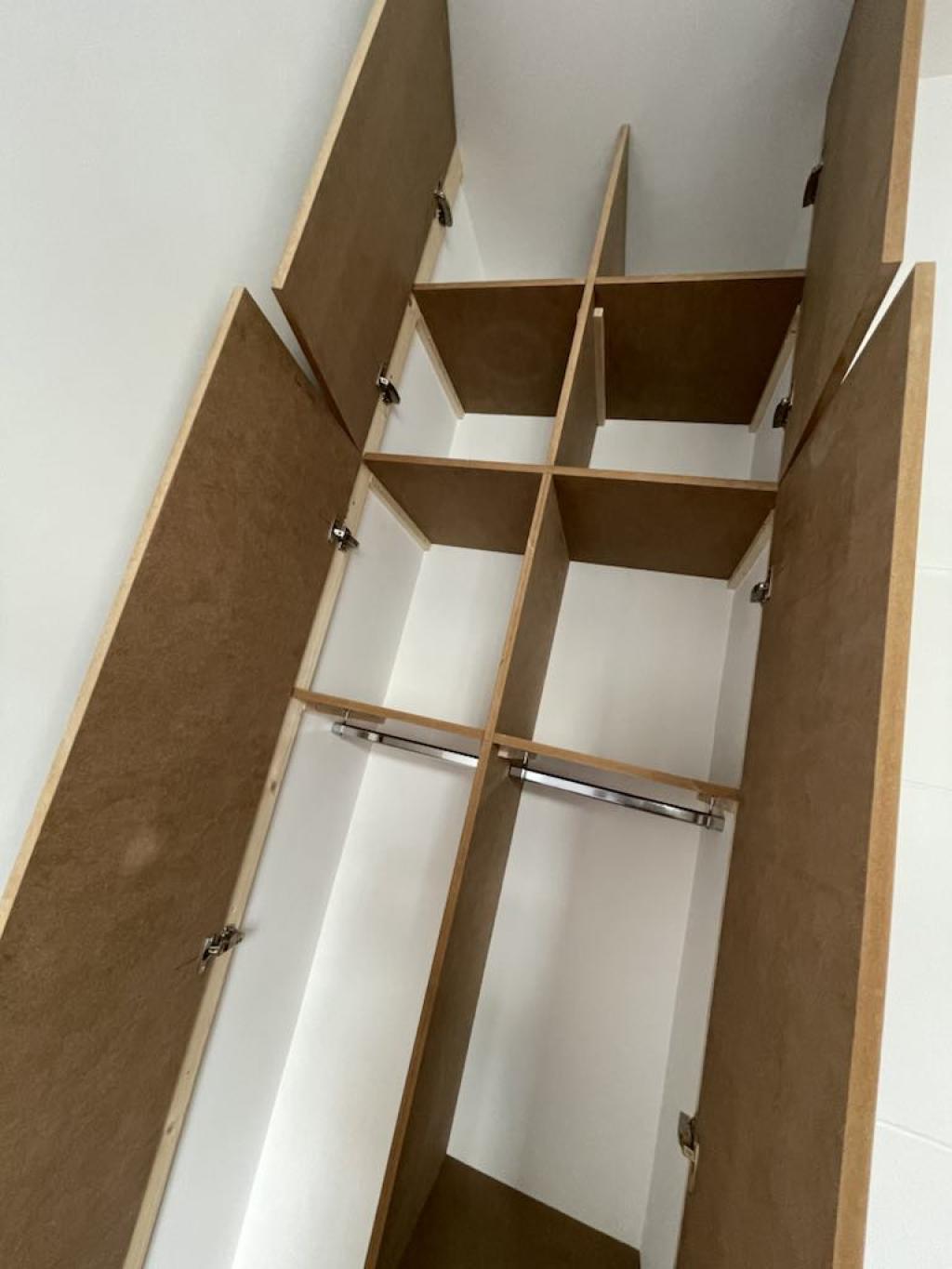 👉 Rangements sous escalier, placards coulissants dans les sous-pentes, niches intégrées, bancs-coffres, meubles d’angle, étagères sur mesure, dressing compact… chaque centimètre compte !