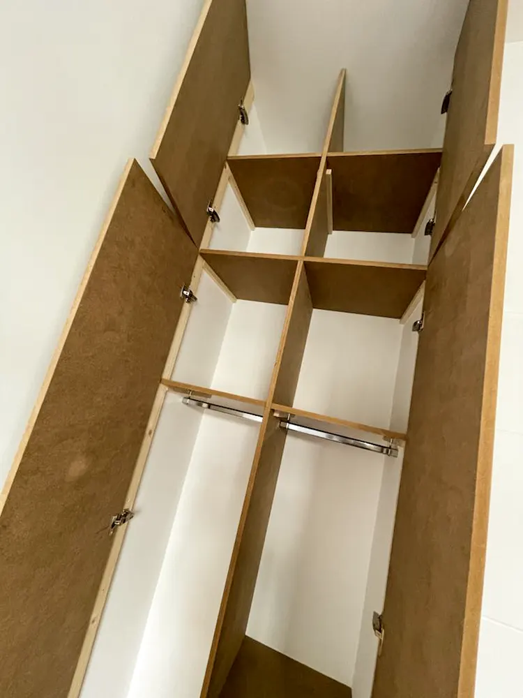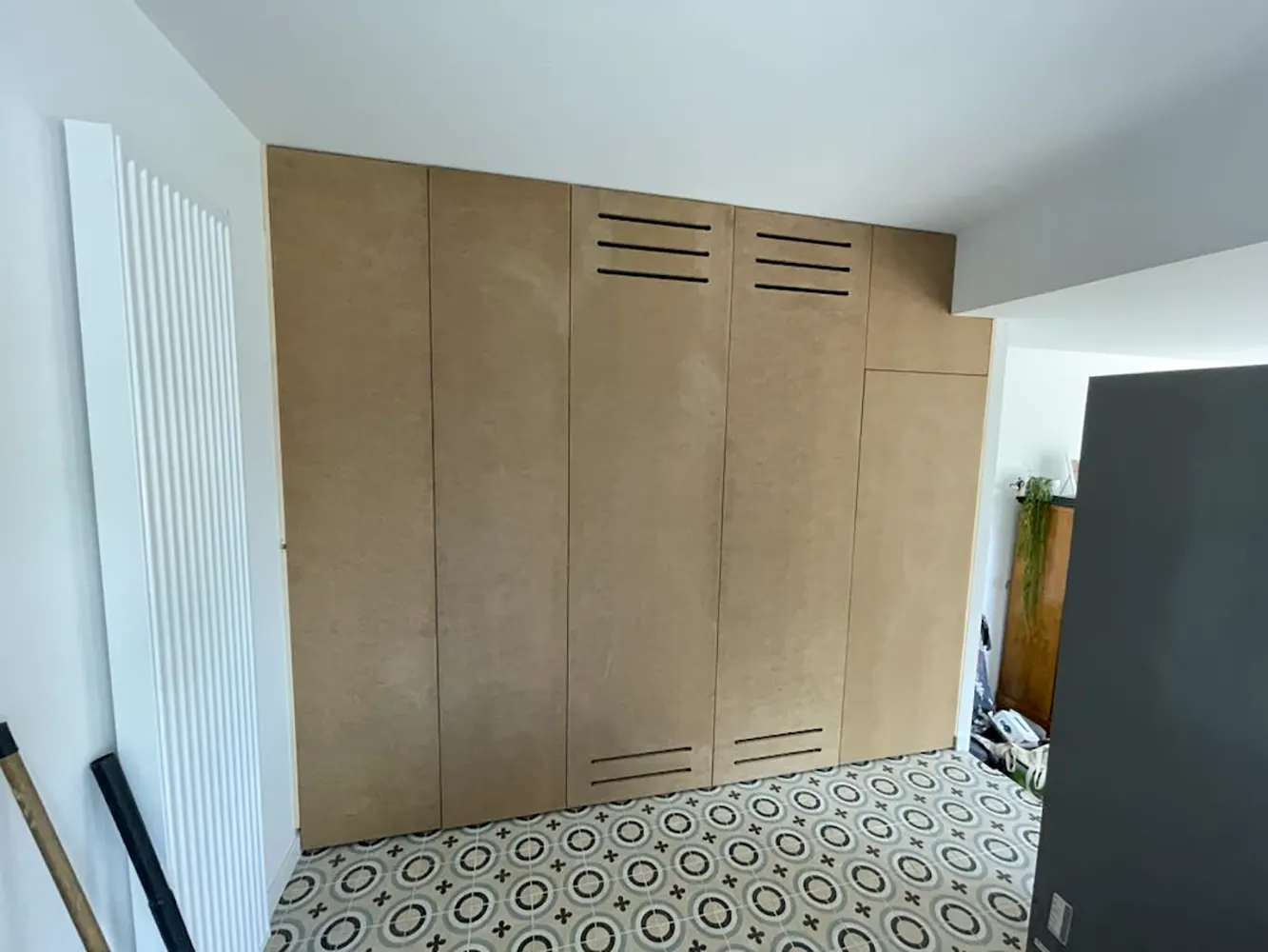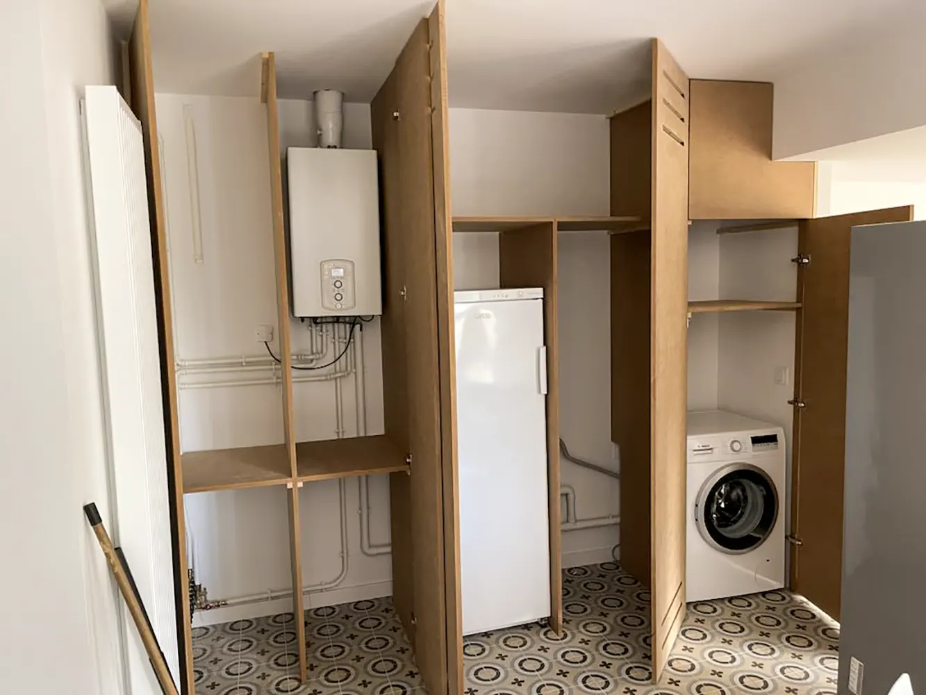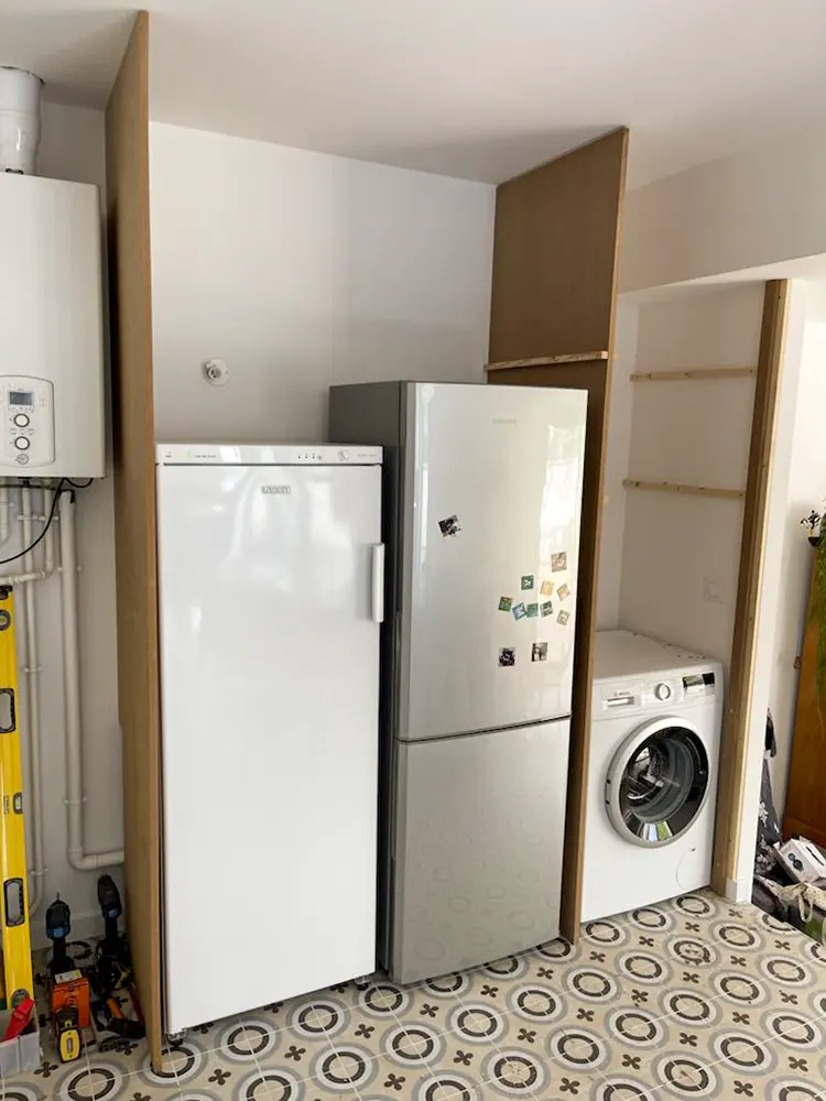 Découvrez notre expertise en aménagement sur mesure pour votre buanderie. Nous réalisons des placards en bois médium de 19 mm d'épaisseur, parfaitement adaptés pour cacher votre électroménager et optimiser l'espace de votre pièce. Grâce aux fentes de ventilation réalisées, vos appareils ne risquent pas la surchauffe, nous concevons des solutions fonctionnelles et esthétiques qui s'intègrent harmonieusement dans votre intérieur. Confiez-nous votre projet et transformez votre buanderie en un espace organisé et élégant.