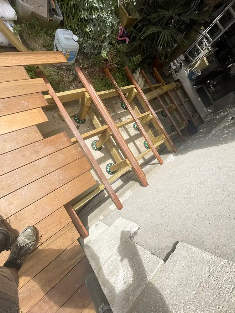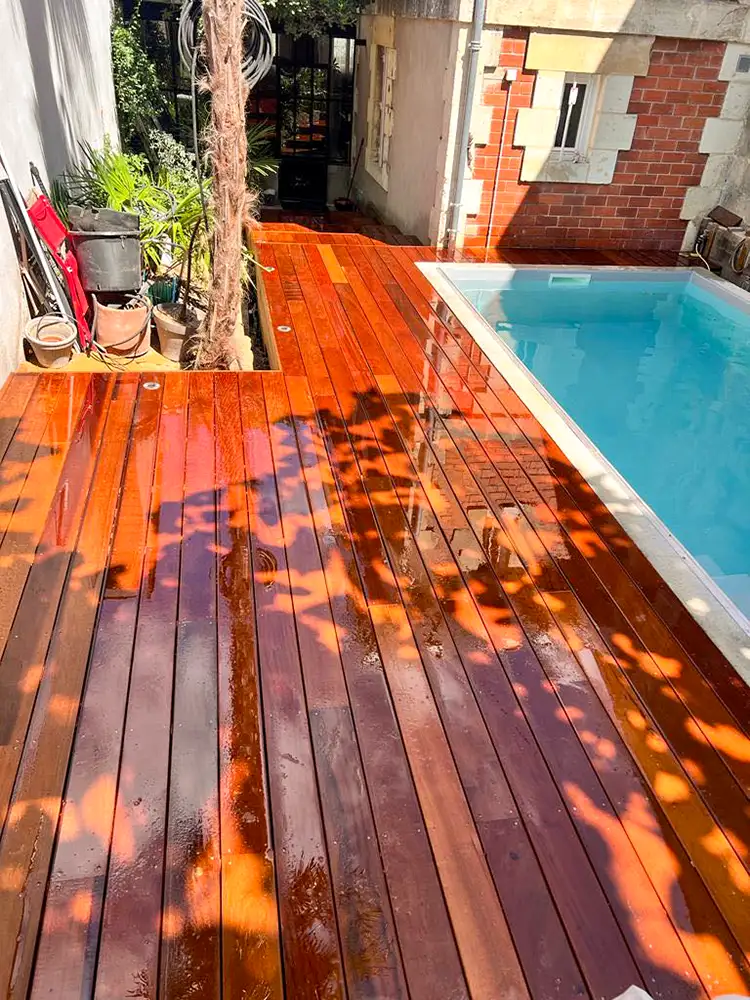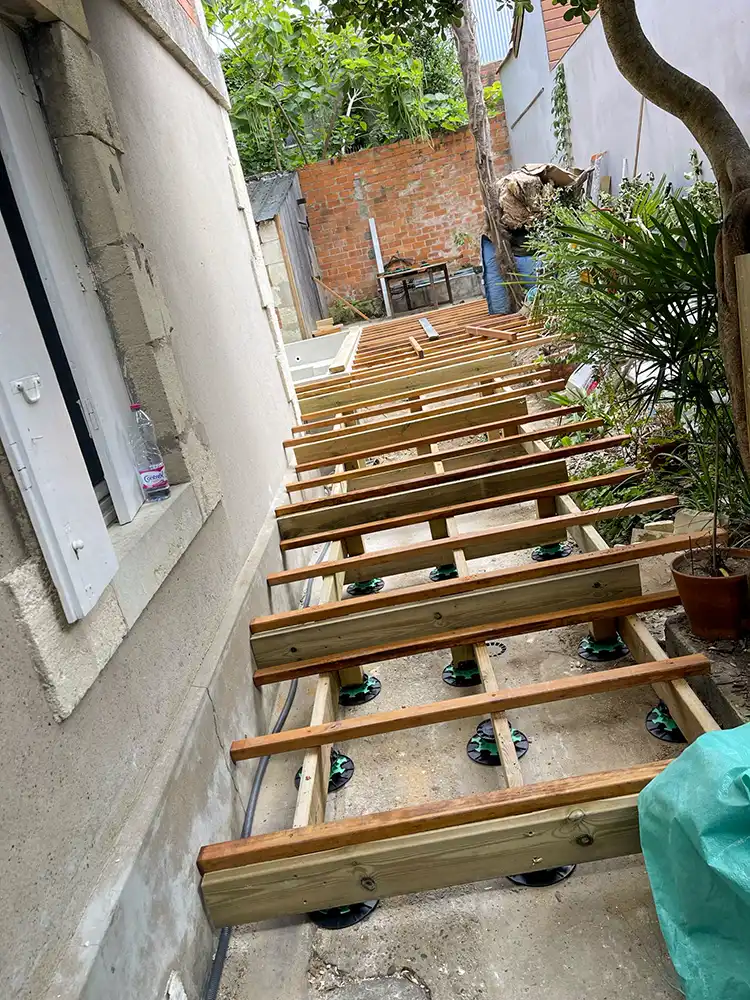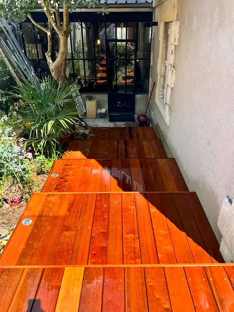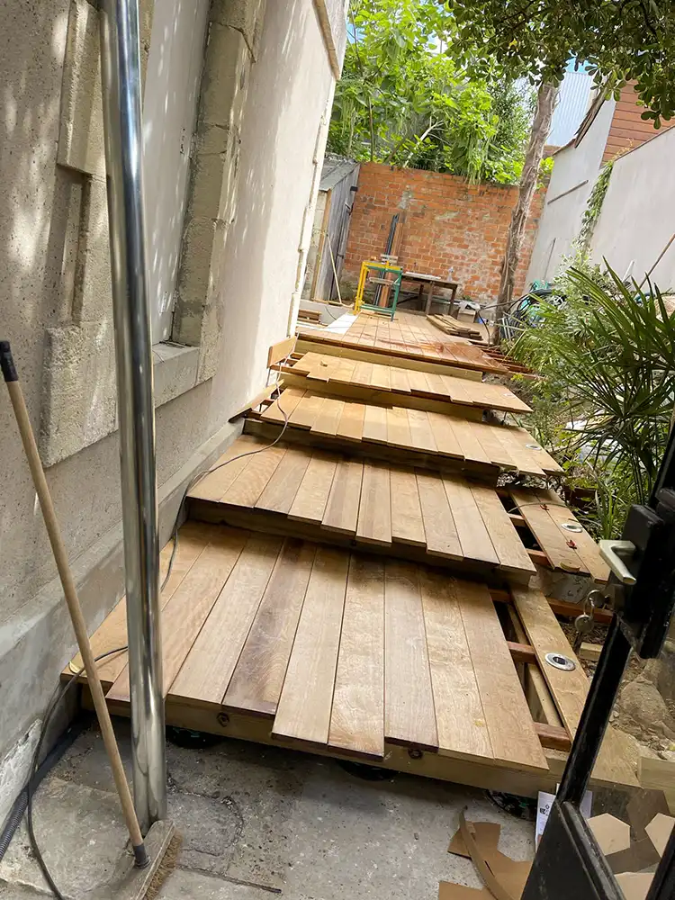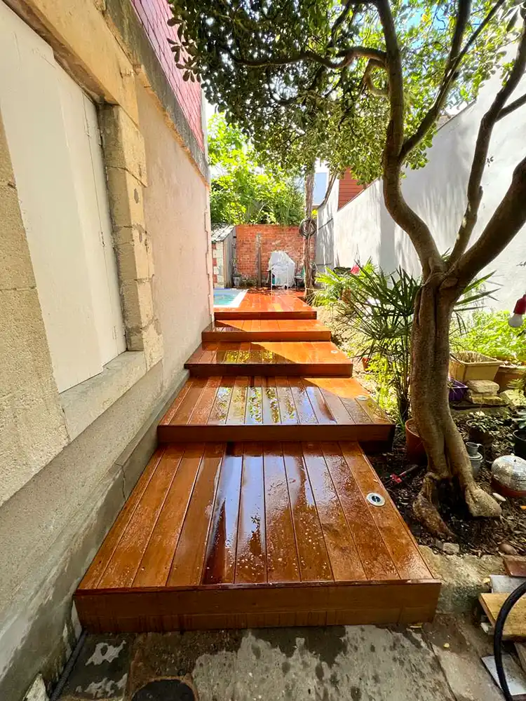 Imaginez-vous déambuler pieds nus sur le bois chaleureux, ressentant la douce caresse sous vos pieds alors que vous vous égarez dans cette oasis luxuriante. Notre équipe a travaillé avec précision et passion pour donner vie à ce coin de paradis dans votre jardin. L'essence exotique du bois CUMARU offre une élégance intemporelle et une résistance remarquable face aux caprices de la météo, assurant ainsi la pérennité et la beauté de votre espace extérieur. Les plots réglables permettent une installation parfaitement nivelée, assurant une stabilité inégalée et un confort absolu à chaque pas. Mais notre vision ne s'arrête pas là. Nous avons conçu un escalier sur mesure, une véritable passerelle entre votre demeure et cet éden verdoyant. Chaque marche devient une invitation à la détente, un lien harmonieux entre l'intérieur et l'extérieur, accentuant ainsi la magie de votre refuge personnel.