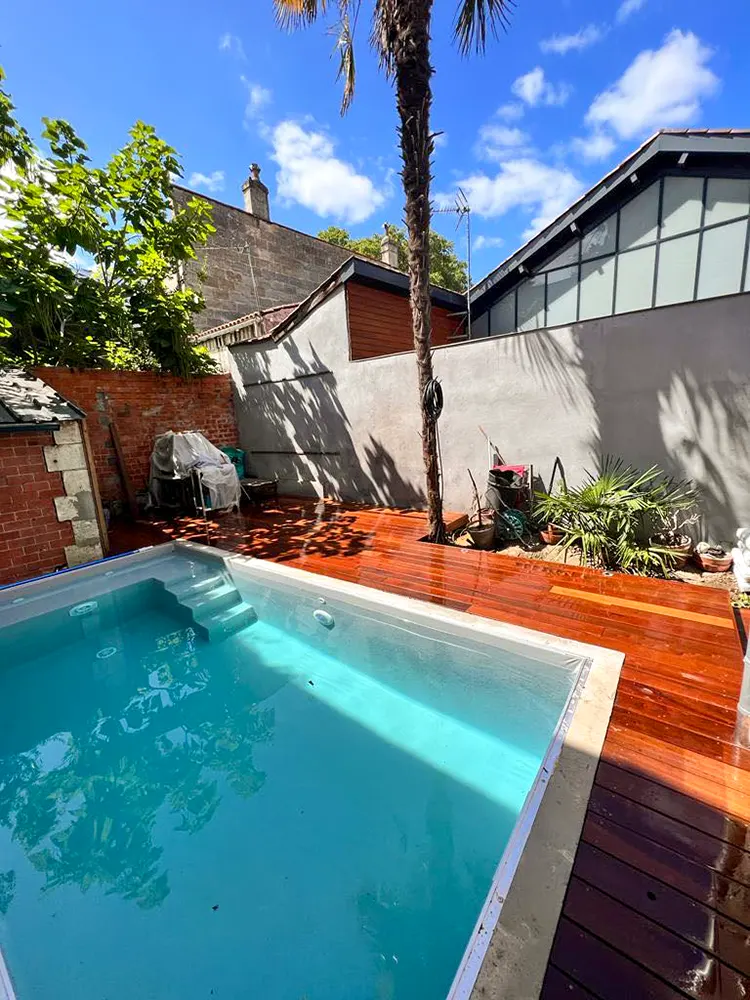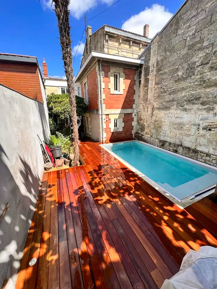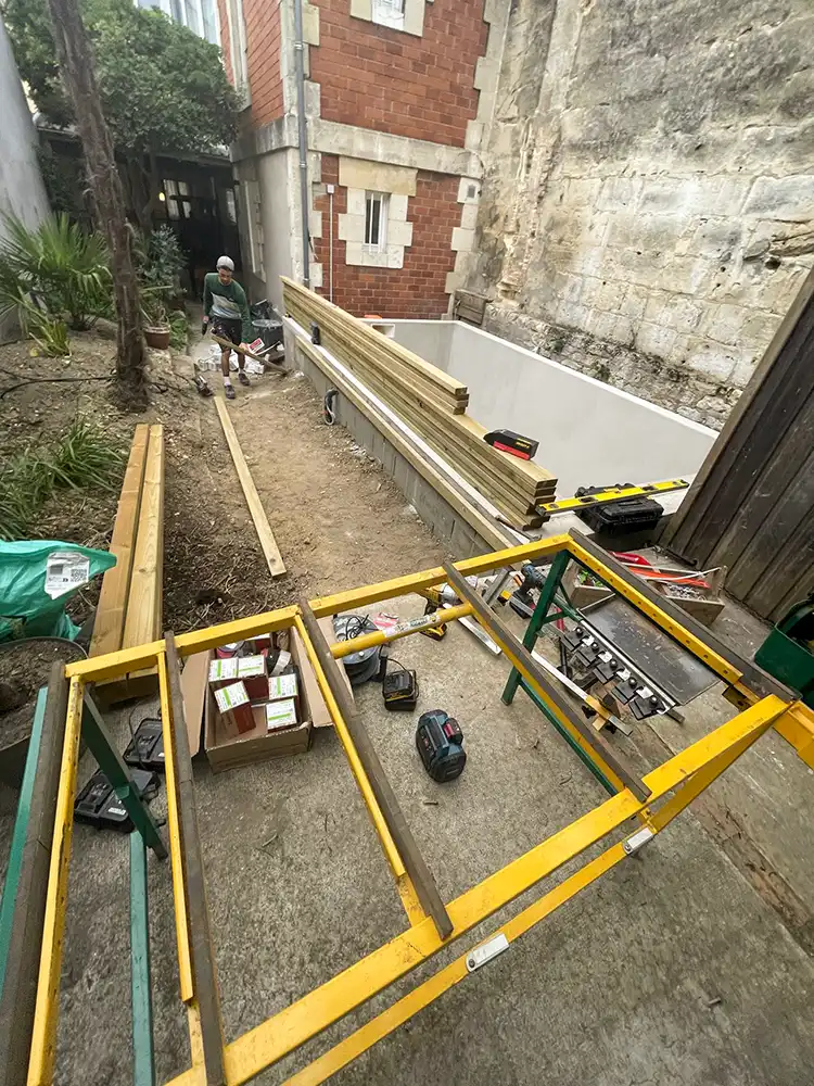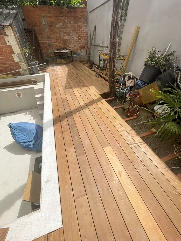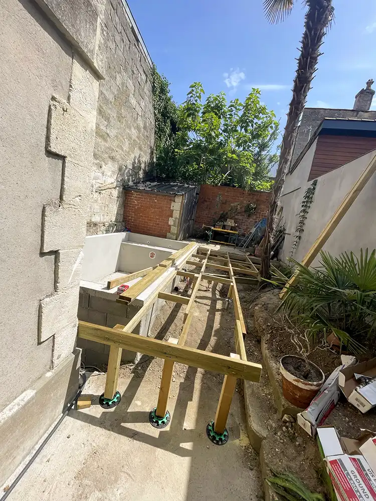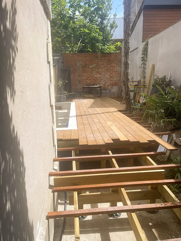 Imaginez-vous déambuler pieds nus sur le bois chaleureux, ressentant la douce caresse sous vos pieds alors que vous vous égarez dans cette oasis luxuriante. Notre équipe a travaillé avec précision et passion pour donner vie à ce coin de paradis dans votre jardin. L'essence exotique du bois CUMARU offre une élégance intemporelle et une résistance remarquable face aux caprices de la météo, assurant ainsi la pérennité et la beauté de votre espace extérieur. Les plots réglables permettent une installation parfaitement nivelée, assurant une stabilité inégalée et un confort absolu à chaque pas. Mais notre vision ne s'arrête pas là. Nous avons conçu un escalier sur mesure, une véritable passerelle entre votre demeure et cet éden verdoyant. Chaque marche devient une invitation à la détente, un lien harmonieux entre l'intérieur et l'extérieur, accentuant ainsi la magie de votre refuge personnel.