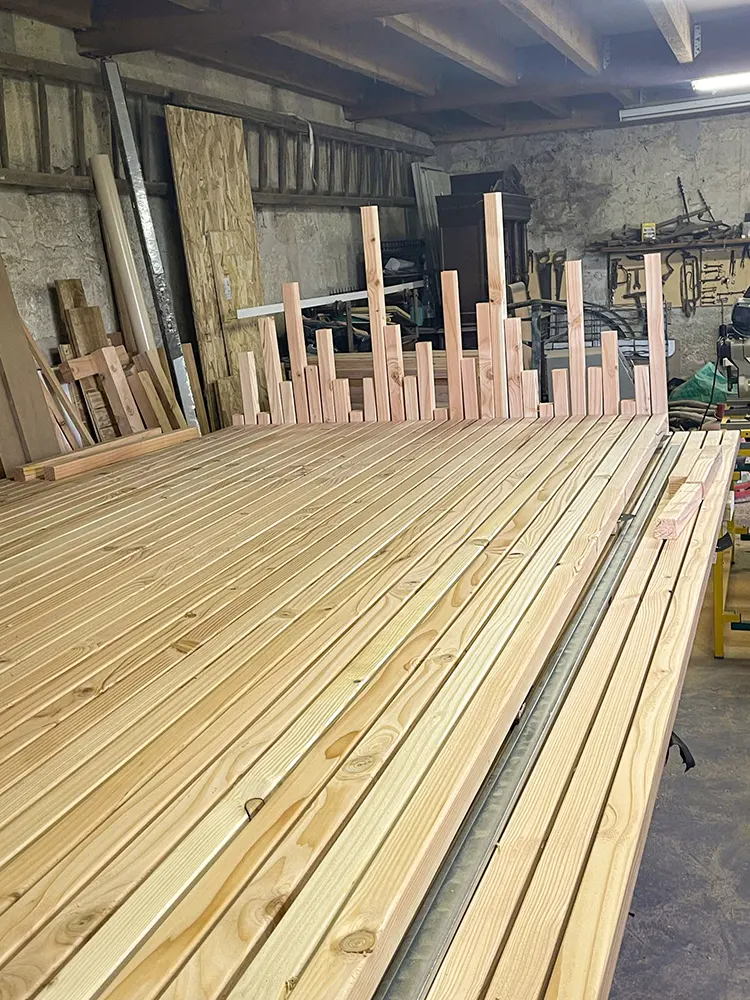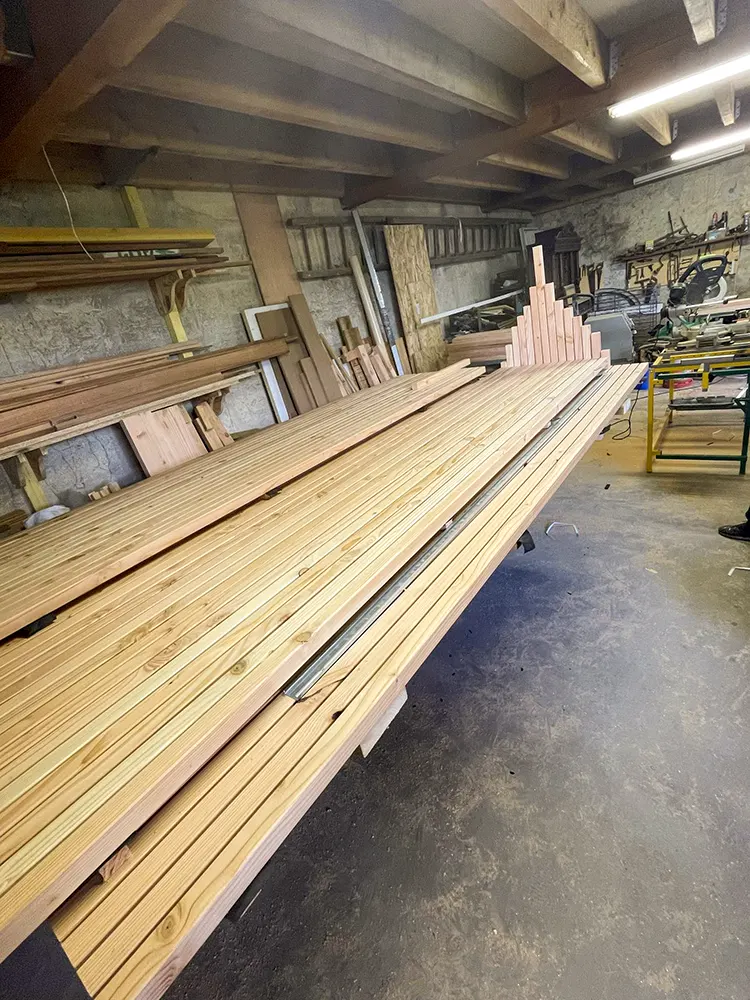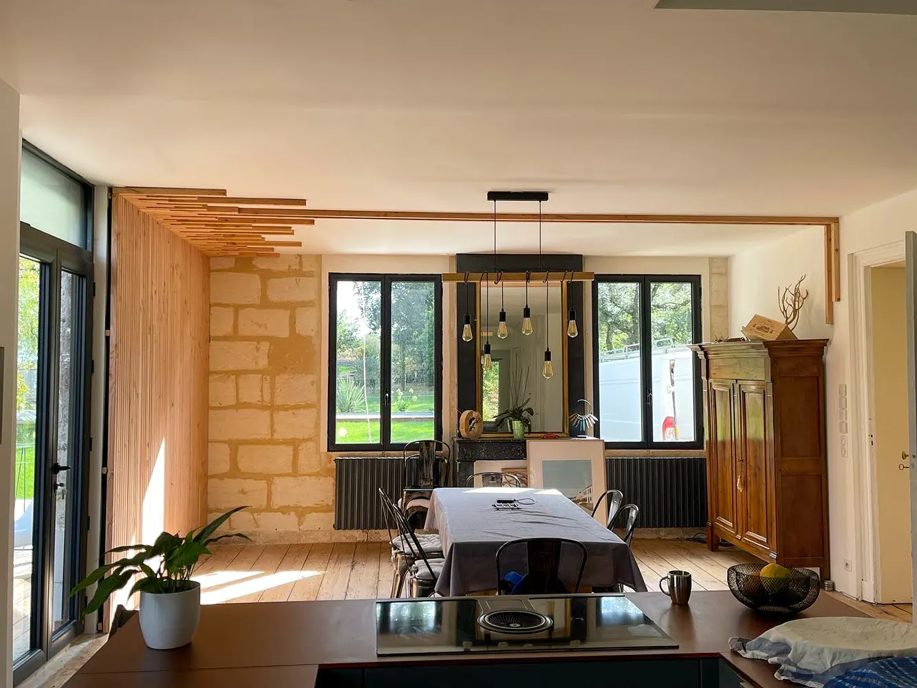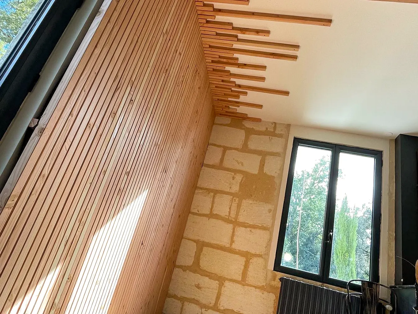 Chaque liteau de bois de Douglas, sélectionné avec soin pour sa qualité et sa durabilité, est façonné par nos artisans, puis assemblé avec précision pour former un motif saisissant qui capte la lumière et crée des jeux d'ombres envoûtants. Ce qui rend notre décor claire-voie encore plus remarquable, c'est son installation audacieuse : les liteaux s'étendent de mur à mur, traversant même le plafond, pour créer une continuité visuelle et une impression de grandeur dans l'espace. Cette technique innovante repousse les limites de la conception traditionnelle, offrant une expérience sensorielle immersive et une esthétique incomparable.